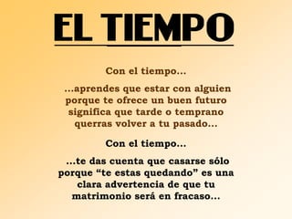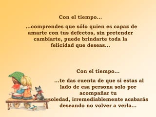 Este documento ofrece una serie de reflexiones sobre las lecciones que se aprenden con el tiempo en las relaciones interpersonales y la vida. Algunas de estas lecciones incluyen que es mejor estar con alguien que te ama con defectos que por conveniencia, que los amigos verdaderos valen más que el dinero, y que las palabras dichas con ira pueden dañar para siempre. En general, enseña que sólo el tiempo puede brindar la sabiduría para valorar lo que realmente importa.