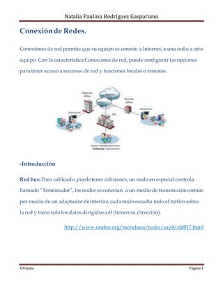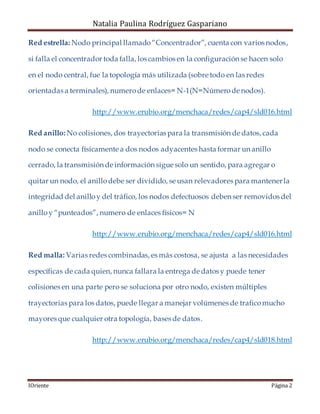El documento describe las principales topologías de red: red de bus, red en estrella y red en anillo. Explica que una red de bus tiene un nodo central llamado terminador y que los nodos se conectan a un medio de transmisión común, mientras que una red en estrella tiene un nodo central llamado concentrador y los nodos se conectan directamente a él. Una red en anillo conecta físicamente cada nodo a dos nodos adyacentes para formar un anillo cerrado por donde la transmisión de datos sigue solo un sentido.