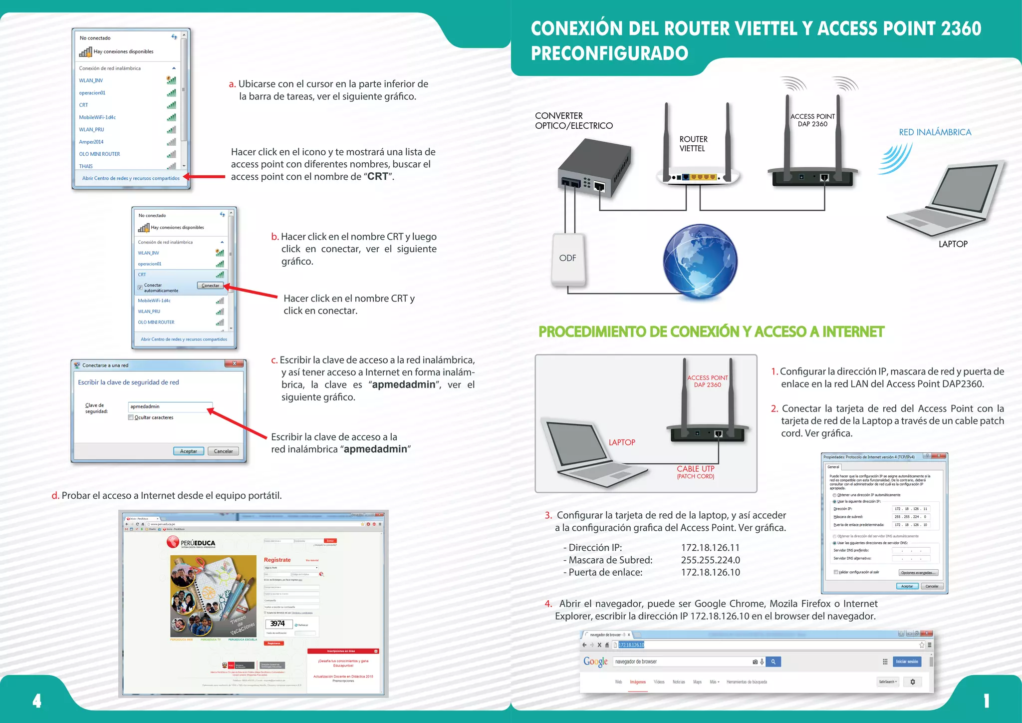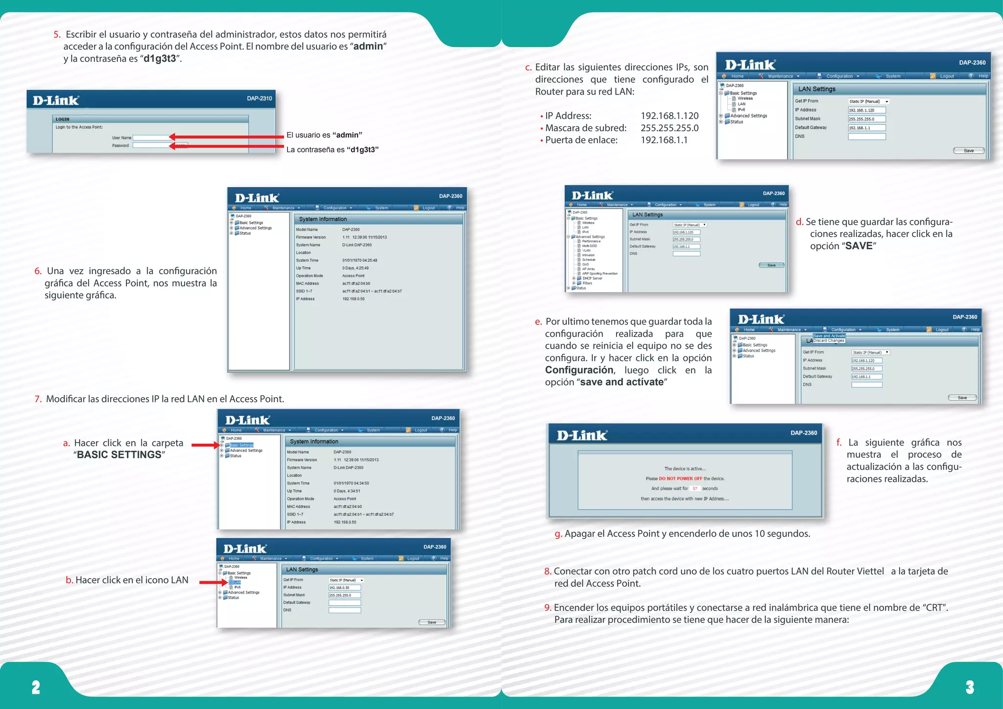 El documento describe los pasos para configurar una conexión entre un Access Point DAP2360 y una laptop a través de una red LAN. Estos incluyen configurar las direcciones IP y la puerta de enlace en el Access Point y la laptop, conectarlos con un cable, y acceder a la configuración gráfica del Access Point ingresando su dirección IP en un navegador.