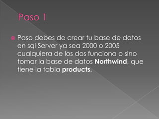 El documento describe 5 pasos para conectar una base de datos SQL Server a PHP: 1) crear o usar una base de datos existente en SQL Server, 2) modificar el archivo PHP.ini para habilitar la extensión PHP_mssql.dll, 3) crear un archivo Conectar.php, 4) reiniciar el servicio Apache desde el Panel de Control, y 5) ejecutar el archivo Conectar.php para establecer la conexión.