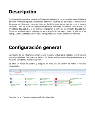 El documento describe cómo configurar la conexión remota de clientes a una base de datos Oracle alojada en un servidor. Se estableció un servidor con la dirección IP 192.168.2.1 y clientes con direcciones IP desde 192.168.2.2. En el servidor se crearon usuarios con diferentes permisos y una tabla de prueba. Luego, usuarios con permisos específicos insertaron, actualizaron, eliminaron y consultaron datos en la tabla para probar la configuración.