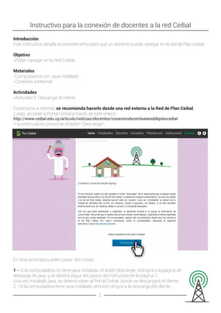 Este instructivo detalla los pasos para que un docente pueda conectarse a la red Ceibal, incluyendo descargar el cliente, instalar Java si es necesario, registrarse con su cédula de identidad como usuario y contraseña, y esperar 3 días para poder navegar en las escuelas.