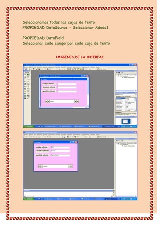 Este documento proporciona instrucciones en 3 pasos para conectar una base de datos Access con Visual Basic: 1) Agregar un control ActiveX Data Objects (ADO) al proyecto y establecer su cadena de conexión; 2) Seleccionar el proveedor OLE DB, crear una nueva conexión DSN al archivo de base de datos, y examinar y seleccionar la base de datos; 3) Configurar las propiedades RecordSource, DataSource y DataField del control ADO para seleccionar la tabla y campos de la base de datos que se mostrarán en las cajas de