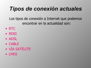 El documento describe los principales tipos de conexión a Internet disponibles actualmente: RTC (Red Telefónica Conmutada), RDSI (Red Digital de Servicios Integrados), ADSL (Línea de Abonado Digital Asimétrica), cable, vía satélite y LMDI (Local Multipoint Distribution System). Cada uno se caracteriza por su tecnología de transmisión de datos y las velocidades de conexión que permiten.