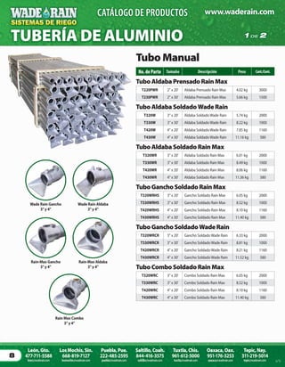 El documento es un catálogo de productos de la empresa Waderain, que incluye información detallada sobre una variedad de tuberías, accesorios y componentes de sistemas de distribución de agua, como aldabas, ganchos, codos y válvulas. Cada producto presenta especificaciones como tamaño, descripción, peso y cantidad por contenedor. Además, se proporciona información de contacto y ubicaciones de la empresa en varias ciudades de México.