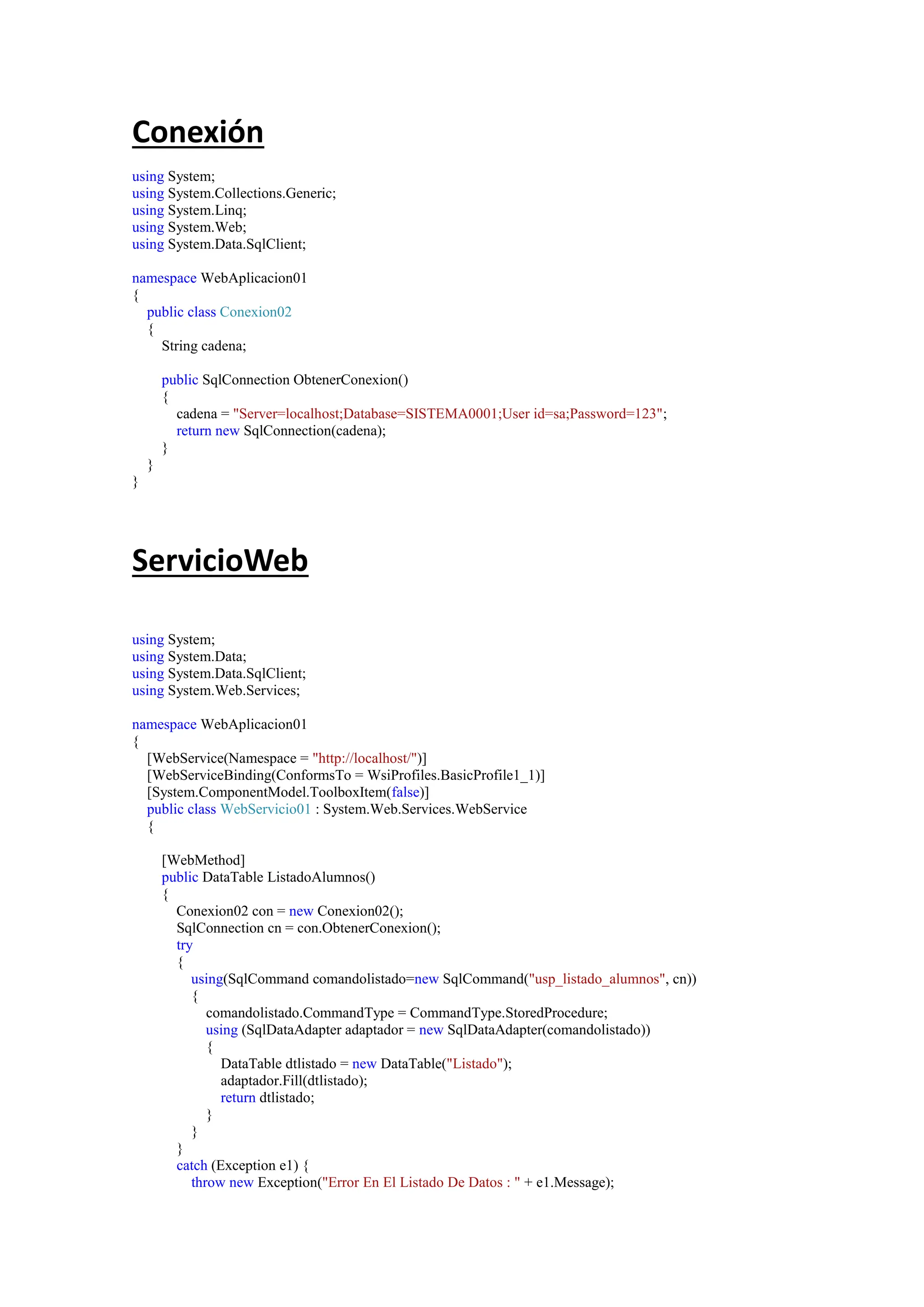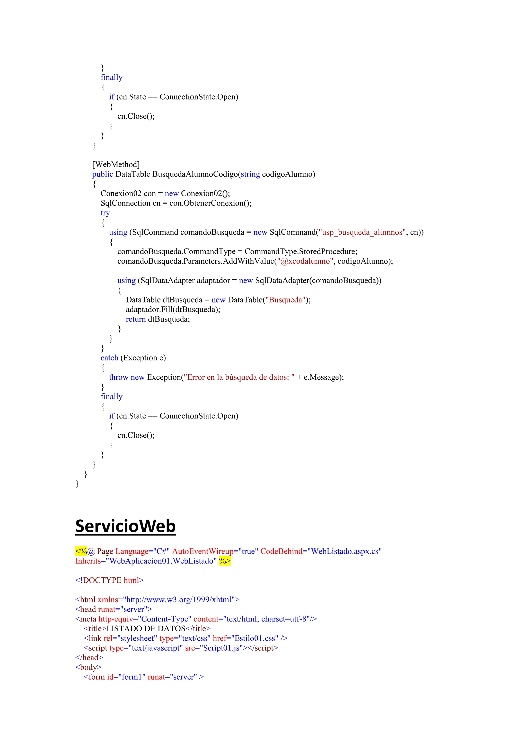 El documento presenta una aplicación web en C# que incluye un servicio web para conectarse a una base de datos SQL, proporcionando métodos para listar y buscar alumnos utilizando procedimientos almacenados. Define una clase de conexión y un servicio web con métodos que retornan DataTables. Además, se incluye el código para una página web con formularios para la interacción del usuario.