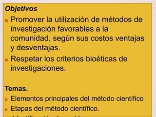 Este documento describe el método científico, incluyendo sus objetivos, temas, conceptos, elementos y etapas. Explica que el método científico es un proceso para explicar fenómenos y establecer relaciones entre hechos mediante la observación y deducción de leyes. También discute diferentes categorías y enfoques del método científico, como el inductivo-deductivo, a priori-deductivo e hipotético-deductivo.
