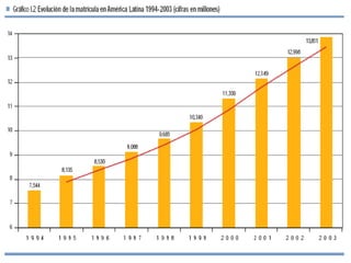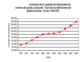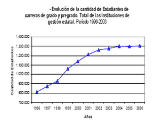 El documento presenta un cronograma de intervenciones y leyes relacionadas con la educación universitaria en Argentina desde 1885 hasta 1995, destacando la Ley Avellaneda, varias legislaciones de Perón y otros gobiernos. También se incluye un registro del crecimiento de la matrícula universitaria en la UBA a lo largo de los años, mostrando un aumento significativo desde 1910 hasta 2006. Estas cifras reflejan la evolución de la educación superior en el país en un contexto político cambiante.