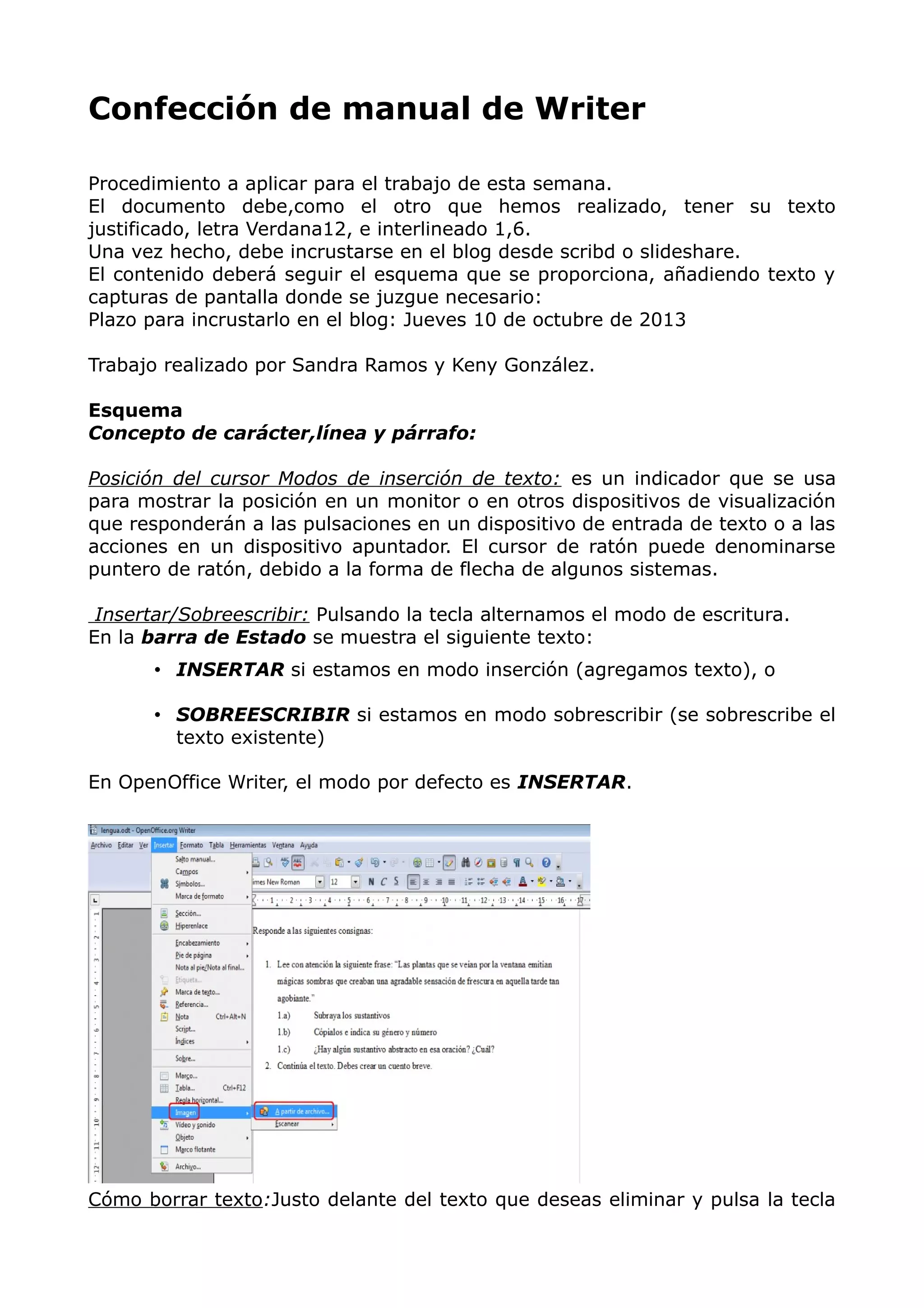 El documento proporciona un esquema y procedimiento para la creación de un manual en OpenOffice Writer. Incluye instrucciones sobre el formato, contenido, fecha límite y autores del manual. Además, detalla los conceptos y herramientas básicas de Writer como formato de caracteres, párrafos, páginas, tablas, imágenes y ecuaciones.
