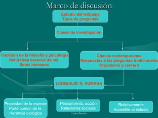 El documento resume los principales puntos de discusión de la conferencia sobre los principios de la estructura del lenguaje de Noam Chomsky. Explica que el lenguaje es una facultad biológica innata del ser humano determinada por un sistema computacional en el cerebro. Este sistema establece las representaciones estructurales que determinan el sonido y significado del lenguaje de forma inconsciente e inaccesible. El programa de investigación propuesto busca describir la naturaleza de los elementos de este esquema y explicar teóricamente cómo la mente determina la e