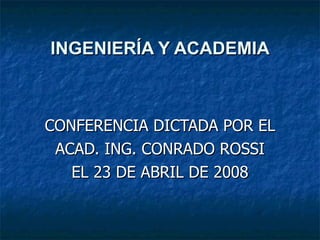 El documento resume la historia de la Academia Nacional de Ingeniería de Uruguay desde su fundación en 1971 hasta el año 2000. Detalla las asambleas celebradas, los académicos nombrados, los estatutos aprobados y las revisiones realizadas. También describe el "Día de la Academia", un evento anual para conmemorar la institución que comenzó en 1972 e incluía conferencias y presentaciones culturales.