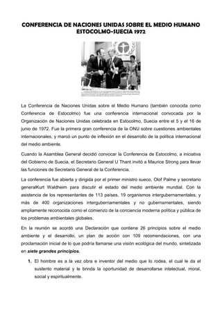 La conferencia de las Naciones Unidas sobre el Medio Humano se celebró en Estocolmo, Suecia en 1972. Fue la primera gran conferencia de la ONU sobre cuestiones ambientales internacionales. En la conferencia, que contó con la participación de 113 países, se acordó una Declaración con 26 principios sobre el medio ambiente y el desarrollo y un plan de acción con 109 recomendaciones para abordar los problemas ambientales globales.