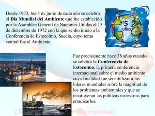 La Conferencia de Estocolmo de 1972 fue la primera conferencia internacional sobre el medio ambiente. Participaron 1,200 delegados de 110 países. Estableció el Día Mundial del Medio Ambiente y creó el Programa de las Naciones Unidas para el Medio Ambiente. Aprobó 26 principios y 103 recomendaciones para proteger los ecosistemas, especies en peligro, y combatir la contaminación.