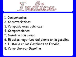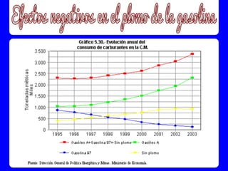 El documento aborda la composición, características y efectos de la gasolina, destacando el uso de plomo y manganeso en su producción y sus impactos negativos en la salud y el medio ambiente. Se revisa la historia de la gasolina en España y se sugieren métodos para ahorrar combustible, así como alternativas energéticas ante el aumento de los precios del petróleo. Además, se proporciona información técnica sobre la densidad y proporción de energía de la gasolina en comparación con otros combustibles.