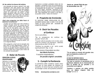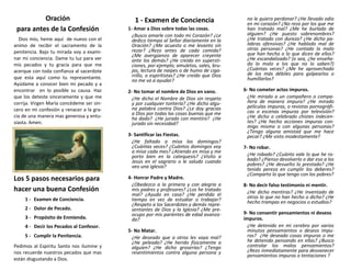 Este documento presenta una guía para el examen de conciencia y la confesión de pecados. Incluye preguntas para reflexionar sobre los Diez Mandamientos y otras áreas como el amor a Dios, el respeto a los padres, pensamientos y acciones impuras, entre otros. También describe los cinco pasos necesarios para una buena confesión: examen de conciencia, dolor de pecado, propósito de enmienda, confesar los pecados al sacerdote y cumplir la penitencia. El objetivo es ayudar a los creyentes