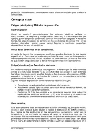 1) El documento discute la confiabilidad electrónica y eléctrica, explicando que a diferencia de los sistemas mecánicos, los sistemas electrónicos no se desgastan típicamente. 2) Describe las tres zonas de la curva de bañera y cómo se aplican a los sistemas electrónicos. 3) Identifica algunas causas comunes de falla como electromigración, deriva de parámetros, calor excesivo e interferencia electromagnética, y métodos para proteger contra ellas.