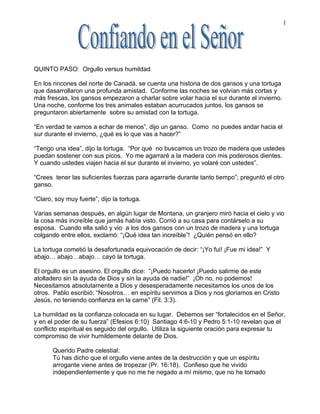 La historia cuenta sobre dos gansos y una tortuga que eran amigos. Cuando llegó el invierno, los gansos planeaban volar hacia el sur mientras que la tortuga no podía. La tortuga tuvo la idea de que los gansos la llevaran volando agarrada a un pedazo de madera. Más tarde, cuando los tres animales volaban juntos, la tortuga cometió el error de alardear sobre haber tenido la idea, lo que hizo que cayera. El documento luego habla sobre la diferencia entre el orgullo y la humildad, y