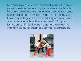 La confianza se genera internamente a través del convencimiento en nuestras propias capacidades y cualidades, las cuales se desarrollan al lograr éxito en las tareas y mantener relaciones de calidad. En la infancia se necesita la seguridad y atención del entorno, especialmente de los padres, pero de adultos debemos trabajar personalmente en nuestra confianza a través de la paciencia, el tiempo para nosotros mismos y la evaluación de nuestras acciones. La confianza también se refiere a la creencia en la conducta fut