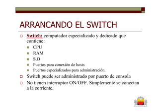 1. El documento describe la configuración inicial y operación básica de un switch, incluyendo encendido, LEDs, modos de comando y configuración por defecto. 2. Explica cómo configurar parámetros como nombre de host, contraseñas, dirección IP y VLANs. 3. Resalta la importancia de realizar copias de seguridad de la configuración y el IOS del switch.