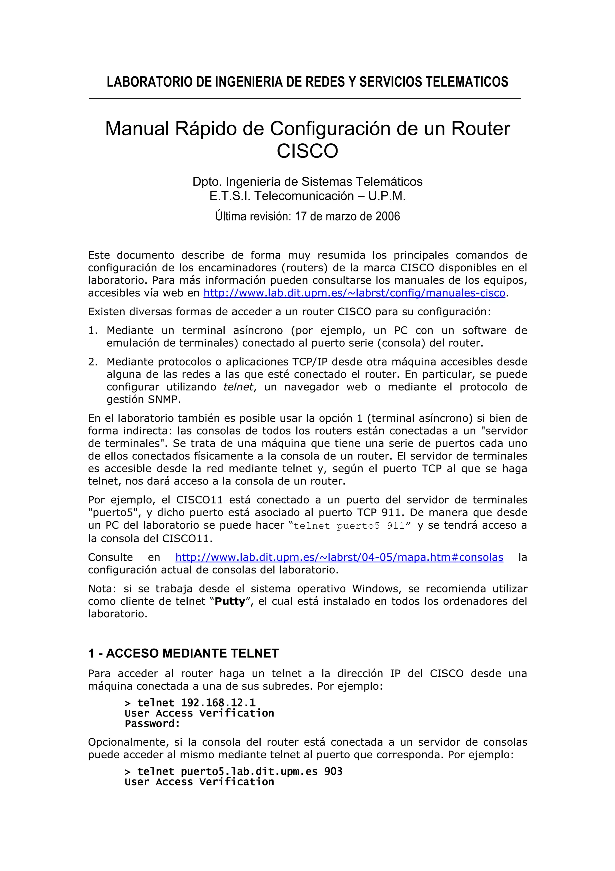 Este documento describe cómo configurar routers Cisco en un laboratorio. Se explican tres formas de acceder a los routers: 1) a través de un terminal conectado al puerto serie, 2) mediante telnet u otro protocolo TCP/IP, o 3) a través de un servidor de terminales al que están conectadas las consolas de los routers. También se detallan los pasos para modificar la configuración de un router una vez conectado, como añadir rutas o direcciones IP, y cómo borrar la configuración existente.