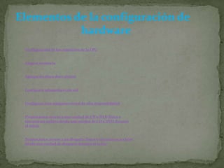 Este documento describe los pasos para configurar el hardware de una máquina virtual, incluyendo asignar memoria y recursos de CPU, agregar discos duros virtuales y adaptadores de red, y configurar el acceso a unidades físicas como CD, DVD o disquetes. También explica cómo especificar los requisitos de CPU y memoria de una máquina virtual al crear o modificar un perfil de hardware.