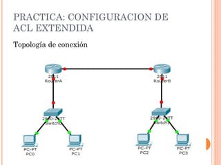 Este documento describe la configuración de dos routers, A y B, y de las ACL extendidas entre las redes conectadas a ellos. Se configuran las interfaces del router A con las IPs 192.168.1.1 y 192.168.2.1 y del router B con 192.168.1.2 y 192.168.3.1. Luego se crea una ACL en el router A para bloquear el tráfico ICMP (ping) entre las redes 192.168.2.0/24 y 192.168.3.0/24.