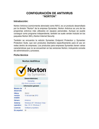 Este documento proporciona instrucciones para instalar Norton Antivirus. Explica que Norton Antivirus es un popular programa antivirus desarrollado por Symantec que ayuda a detectar y eliminar virus. Luego detalla el proceso de 7 pasos para descargar e instalar Norton Antivirus, que incluye iniciar sesión en la cuenta de Norton, descargar el instalador, ejecutarlo y seguir las instrucciones en pantalla hasta que el programa esté completamente instalado y activado.