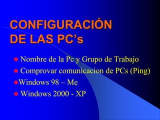Este documento describe los pasos para configurar las PC, incluyendo asignar un nombre y grupo de trabajo a cada PC, verificar la comunicación entre PCs usando el comando Ping, y compartir recursos como discos duros e impresoras entre las PCs.