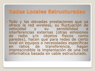 El documento describe diferentes tipos de configuraciones de redes, incluyendo redes locales estructuradas por cable, redes inalámbricas WiFi, redes LAN sobre corriente eléctrica, y redes privadas virtuales. Las redes locales estructuradas son necesarias para transferencias de datos altas o necesidades específicas, mientras que las redes inalámbricas son útiles para equipos móviles o donde no sea posible colocar cables. Las redes LAN sobre corriente eléctrica permiten eliminar cables al transmitir señales Ethernet