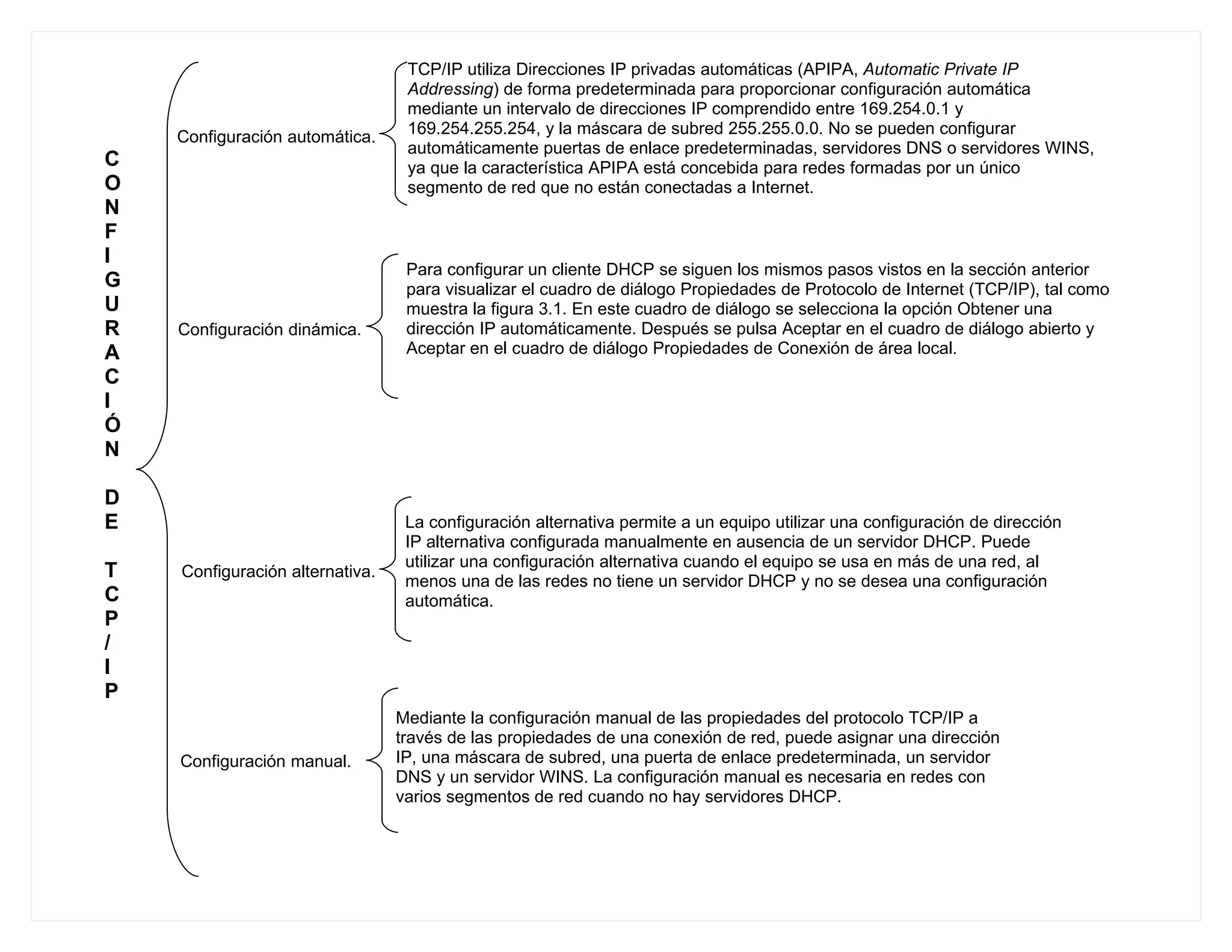 El documento describe tres métodos de configuración de TCP/IP: configuración automática mediante APIPA para redes sin servidor DHCP, configuración dinámica mediante DHCP, y configuración alternativa o manual para redes con varios segmentos o sin DHCP.