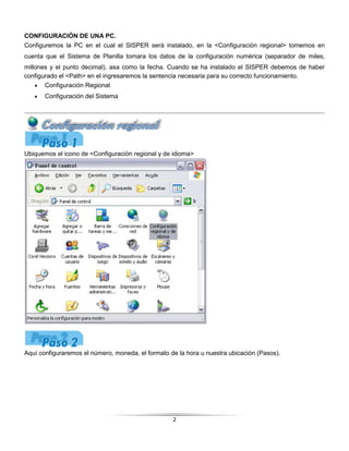 Este documento proporciona instrucciones sobre cómo configurar una PC, incluyendo la configuración regional, el panel de control, la red e internet, el hardware y el software. Explica cómo configurar elementos como el teclado, la impresora, el ratón y las conexiones de red. El objetivo es guiar al usuario sobre la operación básica de un equipo de computo.
