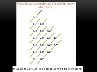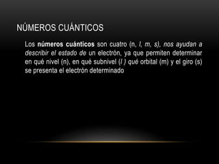 Este documento resume los números cuánticos y la configuración electrónica. Explica que los números cuánticos (n, l, m, s) describen el estado de un electrón al determinar en qué nivel, subnivel, orbital y giro se encuentra. Luego describe cada número cuántico y cómo representa la configuración electrónica la estructura de los electrones en los átomos según los principios de exclusión de Pauli, edificación progresiva y la regla de Hund.