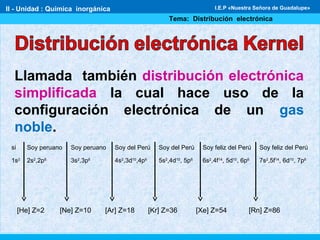 El documento presenta información sobre la distribución electrónica de los elementos químicos. Explica conceptos como la configuración electrónica simplificada usando el gas noble más cercano y muestra ejemplos de distribuciones electrónicas de cationes y aniones. También incluye preguntas de repaso sobre este tema.