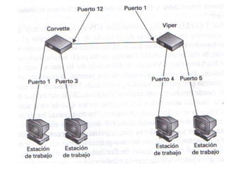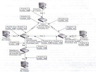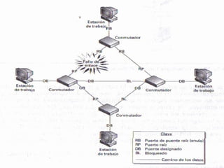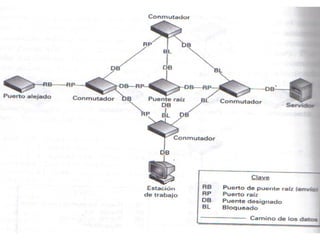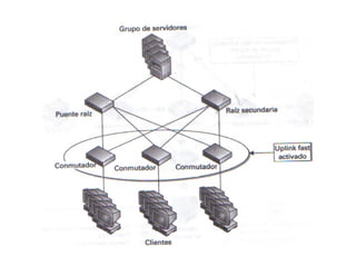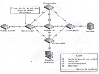 Este documento describe la configuración básica de STP en un conmutador. Explica cómo determinar el puente raíz, configurar los temporizadores STP como el diámetro, y activar características como Backbonefast, Uplinkfast y Portfast para mejorar la convergencia de la topología STP. También cubre la desactivación de STP y la protección de raíz para evitar cambios no deseados en la topología STP.