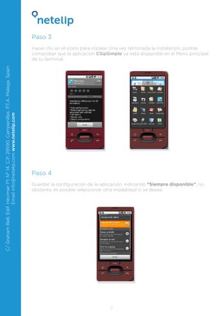Este documento explica los 7 pasos para configurar la aplicación CSipSimple en un teléfono Android y conectarlo al servicio VoIP Netelip para realizar y recibir llamadas, incluyendo registrarse en Netelip, descargar e instalar la aplicación CSipSimple, guardar la configuración de la cuenta SIP de Netelip en la aplicación, y asegurarse de tener conexión a Internet para que la aplicación se registre correctamente.