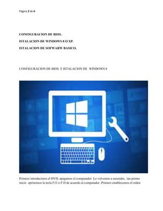 Este documento describe los pasos para configurar el BIOS e instalar Windows 8 o XP en un computador, así como también instalar software básico. Explica primero cómo establecer el orden de arranque en el BIOS para instalar desde un DVD, y luego los pasos para la instalación de Windows, incluyendo la partición del disco, la personalización y configuración. Luego detalla la instalación de software básico insertando un DVD, seleccionando los programas a instalar y validando la instalación.
