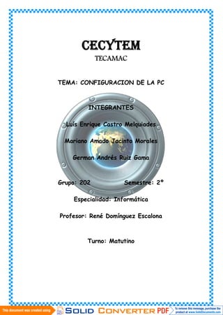Este documento presenta información sobre la configuración de una PC. Detalla los integrantes de un grupo que estudia la especialidad de informática en el CECYTEM TECAMAC. Explica las opciones del panel de control como el escritorio, teclado, impresora, ratón e internet. También cubre temas como medios de almacenamiento, comprimir y descomprimir archivos, y formatear una memoria USB.