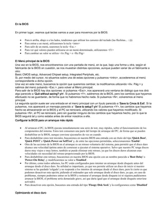 Este documento proporciona instrucciones para configurar la BIOS de un PC para mejorar el rendimiento. Explica que la BIOS controla el arranque del sistema y la detección de hardware. Recomienda optimizar la BIOS deshabilitando pruebas iniciales innecesarias, mejorando la configuración del disco duro, activando cachés y sombras de memoria, y ajustando los tiempos de acceso de la memoria RAM.