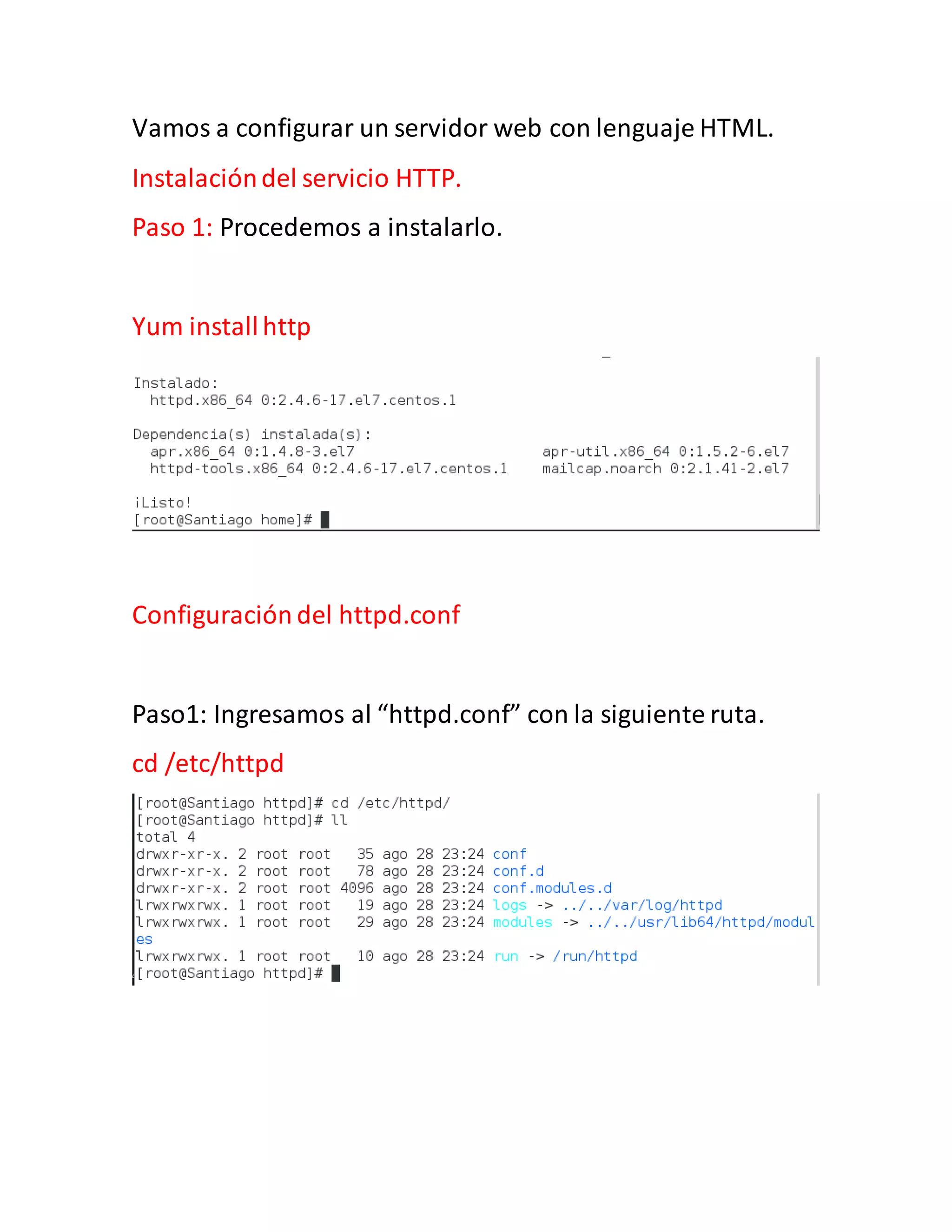 Este documento proporciona instrucciones para configurar un servidor HTTP en CentOS 7. Explica cómo instalar el servicio HTTP, editar el archivo de configuración httpd.conf para establecer la ruta del documento raíz y el nombre del dominio virtual. Luego, crea un archivo HTML de prueba en esa ruta y una carpeta, y agrega una entrada de hosts para mapear el nombre de dominio a la IP del servidor. Finalmente, inicia y comprueba el servidor HTTP.