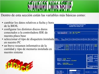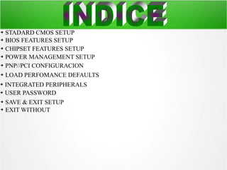 Este documento resume las secciones principales de la configuración de la BIOS de una computadora, incluyendo la configuración de la fecha y hora, discos duros, memoria, ahorro de energía, buses, valores predeterminados de rendimiento y periféricos. También cubre la configuración de contraseñas, guardado y salida de la configuración de la BIOS.