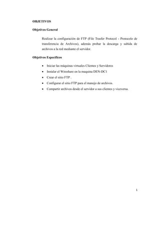 Este documento describe cómo configurar un servidor FTP para permitir la transferencia de archivos. Se instaló FTP en una máquina virtual Windows 2008, se creó un sitio FTP y un directorio compartido. Luego, se descargaron y subieron archivos con éxito entre el servidor y un cliente a través de comandos FTP, verificando el funcionamiento del protocolo FTP. Finalmente, el documento concluye que FTP permite la transferencia de archivos de forma rápida pero carece de seguridad al transmitir nombres de usuario y contraseñas de forma no encriptada.