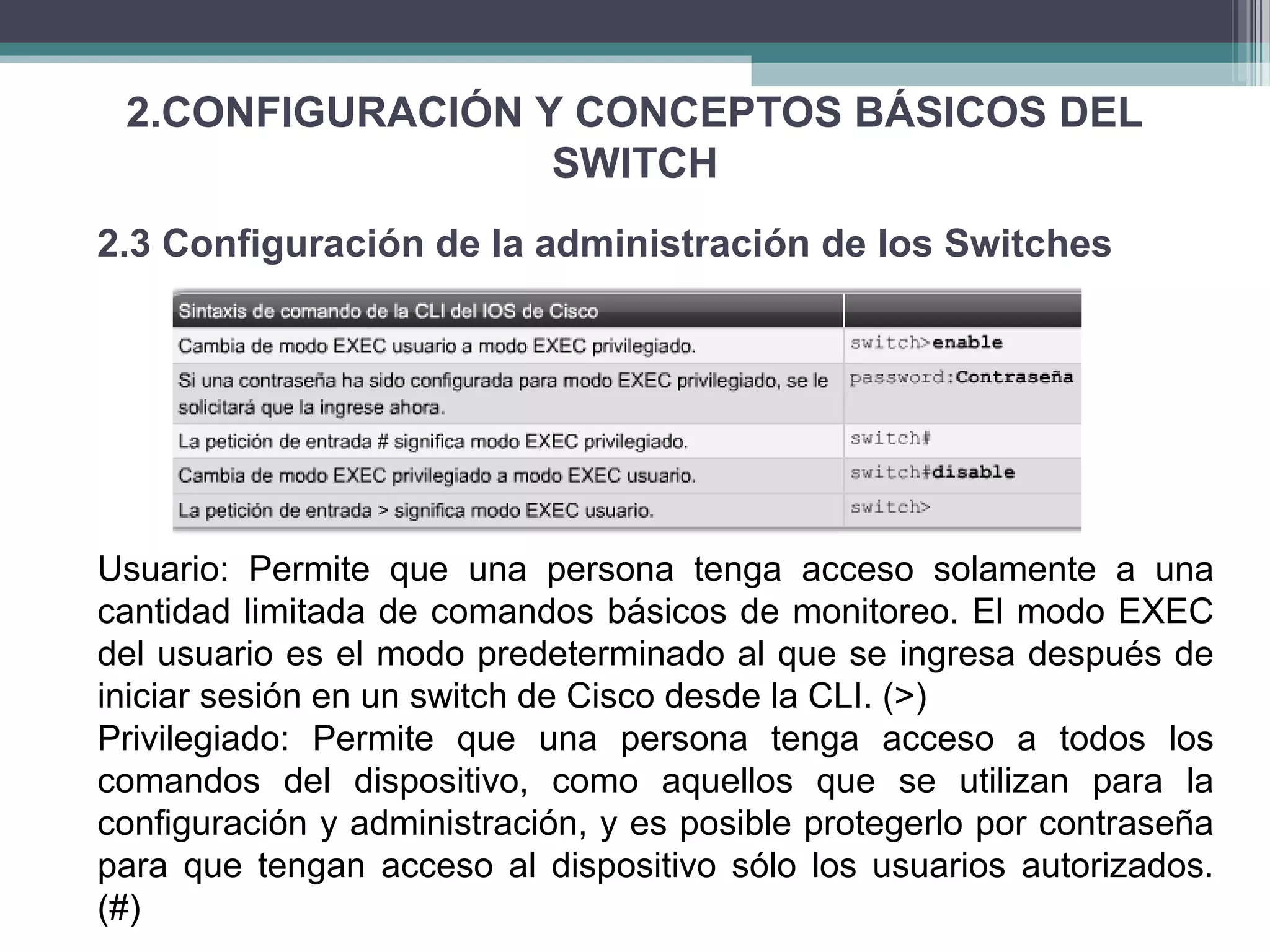 El documento detalla la configuración y administración de switches Cisco, explicando los diferentes modos de acceso para los usuarios y la utilidad del historial de comandos para la gestión de configuraciones. Se incluyen instrucciones para restaurar configuraciones y utilizar servidores TFTP. Además, se mencionan las diferencias entre direcciones MAC dinámicas y estáticas, así como herramientas de configuración basadas en web.