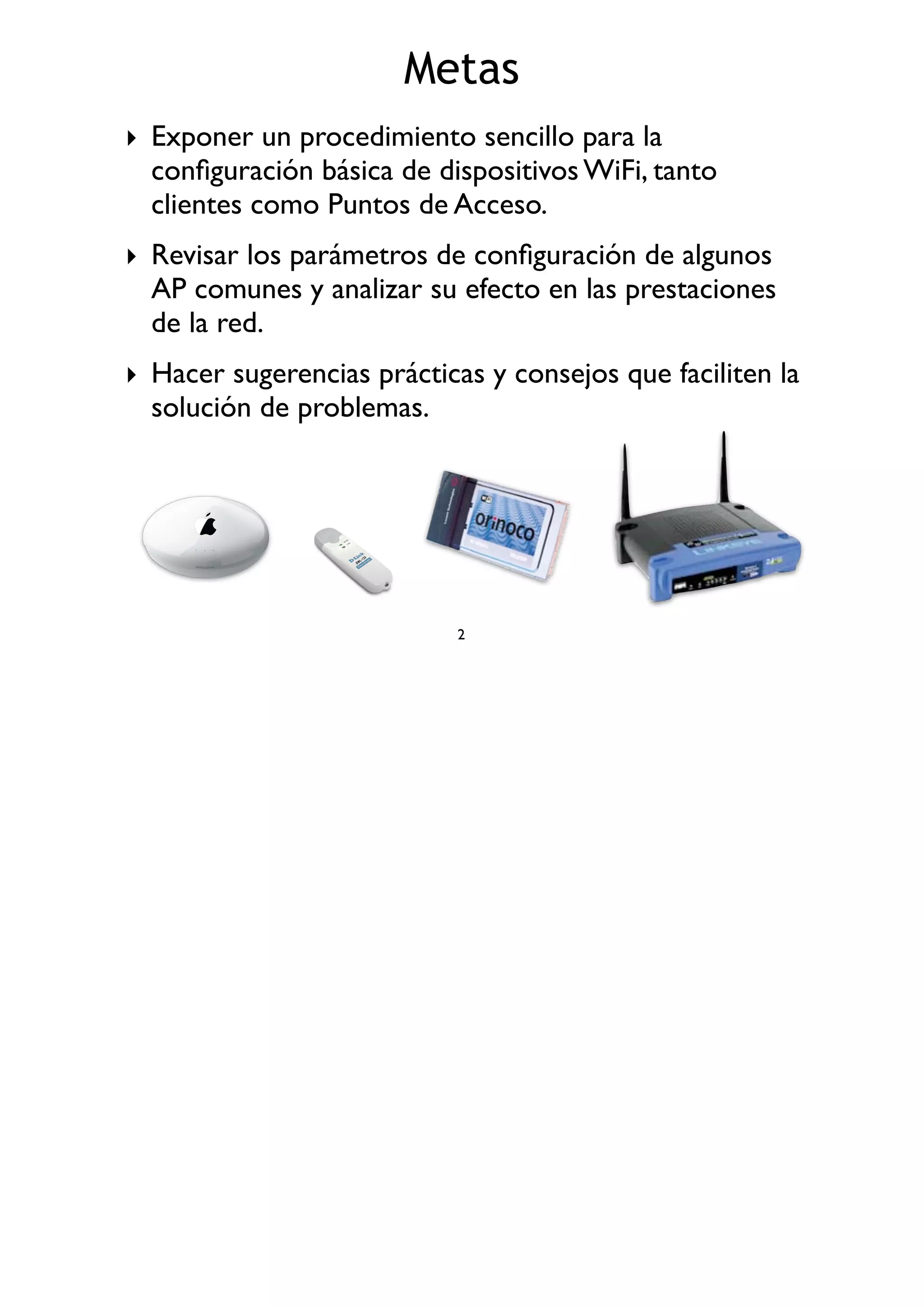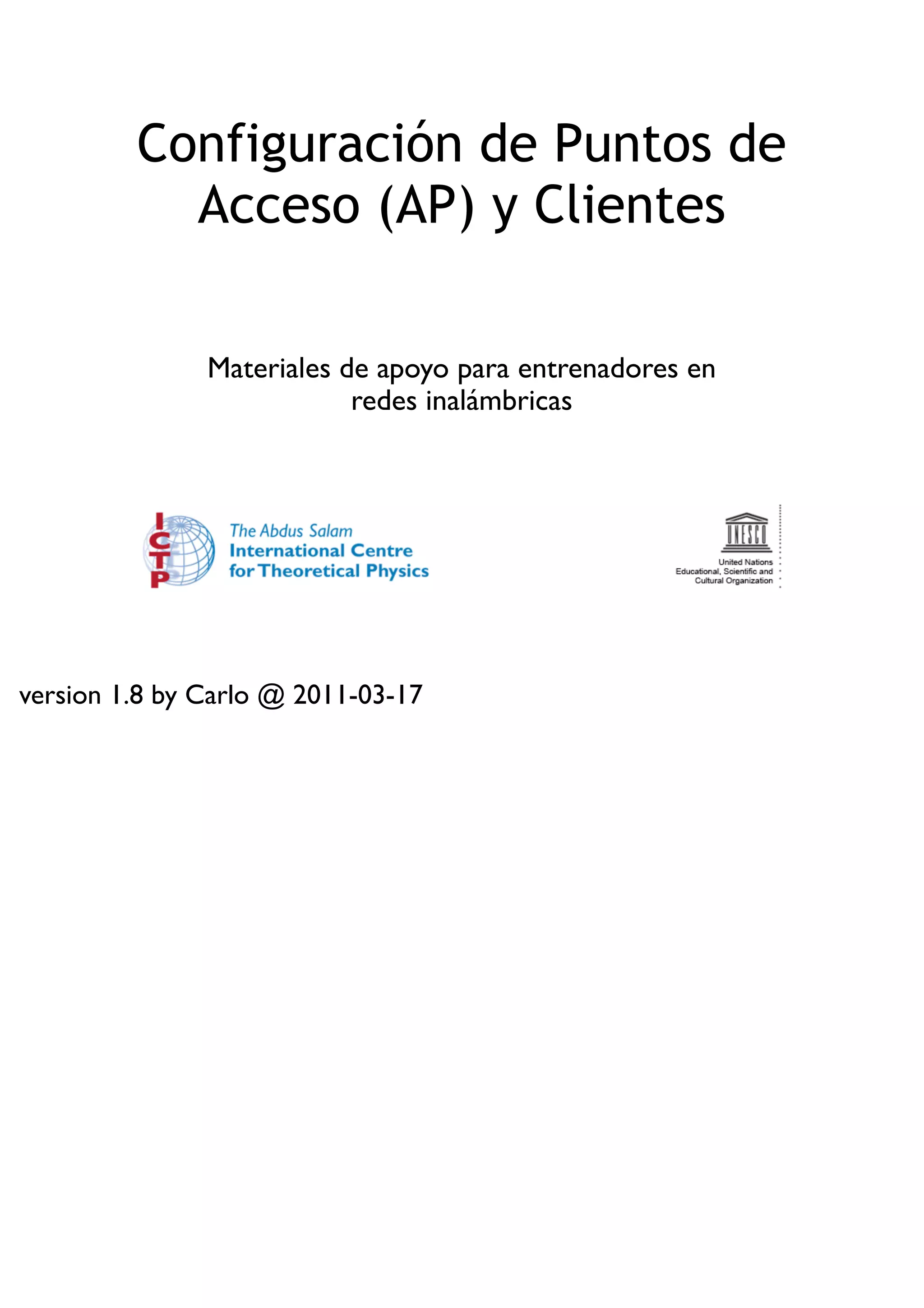 Este documento proporciona instrucciones para la configuración básica de puntos de acceso inalámbricos (AP) y clientes. Explica cómo familiarizarse con los dispositivos, identificar sus puertos e interfaces. Luego detalla los pasos para configurar la interfaz de red, la capa física inalámbrica, la seguridad y otras opciones como enrutamiento y NAT. El objetivo es exponer un procedimiento sencillo para poner en funcionamiento dispositivos WiFi de forma básica.