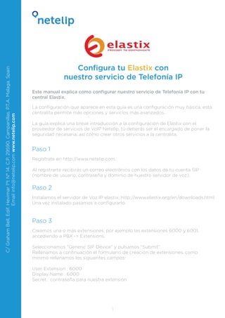 Este manual detalla cómo configurar el servicio de telefonía IP Netelip en una centralita Elastix, comenzando con el registro y la instalación del servidor. Incluye pasos para crear extensiones, troncos y rutas para llamadas entrantes y salientes. Al final, se concluye que la configuración está completa y se puede disfrutar del servicio.