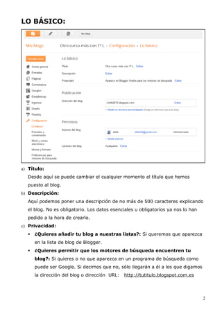 Este documento proporciona instrucciones detalladas sobre cómo configurar y personalizar un blog en Blogger. Explica cómo establecer opciones básicas como el título, la descripción y la privacidad del blog, así como agregar autores y configurar comentarios y entradas. También describe cómo cambiar el diseño y agregar complementos como imágenes y listas de etiquetas. Por último, explica cómo crear y publicar nuevas entradas en el blog.