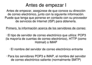 Este documento proporciona instrucciones en 6 pasos para configurar una cuenta de correo electrónico de Outlook Express. Primero se debe obtener la información necesaria como el tipo de servidor, los nombres de los servidores de entrada y salida, y los detalles de la cuenta como la dirección de correo, nombre de usuario y contraseña. Luego, siguiendo los pasos enumerados, se agrega la nueva cuenta en Outlook Express y se ingresan los detalles requeridos. Finalmente, se brindan indicaciones sobre cómo realizar cambios posteriores a la