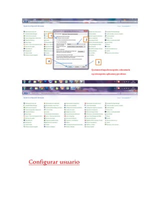 El documento proporciona instrucciones para configurar la barra de tareas y opciones de energía en Windows. Indica los pasos para quitar la opción de aspa, cambiar la opción superior, aplicar los cambios y aceptarlos. También explica cómo modificar las opciones de energía haciendo clic en "Economizador", seleccionar un plan de energía personalizado y configurar los tiempos.