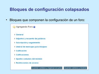 El documento describe la configuración de un foro de discusión en línea, incluyendo opciones para el tipo de foro, adjuntos, suscripciones, seguimiento, umbrales de mensajes, calificaciones y acceso. Los tipos de foro incluyen debates individuales, preguntas y respuestas, blogs y foros generales. Se pueden establecer parámetros como el tamaño máximo de archivo adjunto, número de mensajes antes de bloquear a un usuario, y quién puede calificar las publicaciones. Los usuarios pueden suscribirse de forma opcional, for