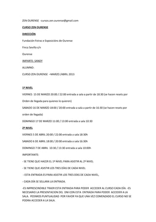 El documento proporciona información sobre un curso de Zen que incluye instrucciones como llevar ropa cómoda, traer materiales para tomar notas, no consumir alcohol antes de la clase, ir al baño antes de que comience la clase, y traer una mentalidad abierta y ganas de aprender. También incluye detalles sobre las fechas y horarios de las sesiones del curso de dos niveles que se llevarán a cabo durante marzo y abril, así como la necesidad de asistir a las tres sesiones de cada nivel y