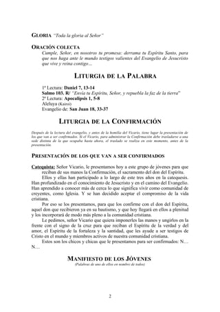 En este documento se describe la celebración del sacramento de la Confirmación en la Parroquia "Santa Clara" de Madrid. Incluye los ritos iniciales como el canto de entrada, la saludo del vicario y la monición de entrada. Luego se describe la liturgia de la palabra con lecturas de la Biblia, el aleluya y el evangelio, seguido de la liturgia de la Confirmación con la presentación de los confirmandos, el manifiesto de los jóvenes y la renovación de las promesas del Bautismo. Finalmente, se imponen las manos a